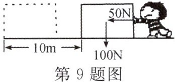 9. 在平地上,一个小朋友用50N的水平推力推着重100N的箱子,前进了10m(如图所示),推箱子的小朋友做了