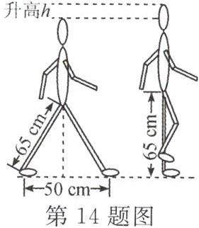 14. 步行是一种简易的健身运动。小华根据自己的腿长和步距画出了如图所示的步行示意图,对步行时重心的变化进行了分析,当两脚一前一后着地时重心降低,而单脚着地迈步时重心升高,因此每走一步都要克服重力做功。如果小华的质量为50kg,请根据图中