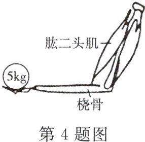 4. 人体中的许多部位都具有杠杆的功能。如图所示是人用手托住物体时手臂的示意图,当人手托5kg的物体保持平衡时,肱二头肌收缩对桡骨所施加力的大小一定(g取10N/kg)(