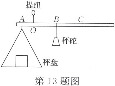 13. 杆秤是一种用来测量物体质量的工具。小金尝试做了如图所示的杆秤。在秤盘上不放重物时,将秤砣移至O点提纽处,杆秤恰好水平平衡,于是小金将此处标为“0”刻度。当秤盘上放一个质量为2kg的物体时,秤砣移到B处,恰好能使杆秤水平平衡,测得OA=5cm,OB=10cm。