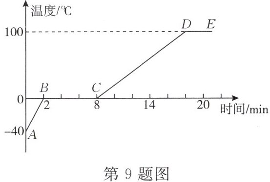 9. 小敏对100g冰加热,并根据冰熔化成水直到沸腾的过程记录数据,绘制成如图所示的温度随时间变化的图像。分析图像发现,造成AB段和CD段升温快慢不同的原因是