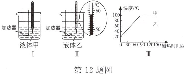 12. 如图Ⅰ、Ⅱ所示,用加热器给初温均为20℃的液体甲、乙加热($m_{甲}<m_{乙}$),两种液体每秒吸收的热量相同,这两种液体的温度随加热时间的变化图像如图Ⅲ所示。