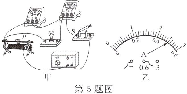 5. 小林想测量小灯泡的额定功率及正常发光时的电阻,小灯泡的额定电压为2.5V,实验电路如图甲所示。实验中,当电压表示数为2.5V时,电流表示数如图乙所示。根据实验过程及现象,下列四个选项中,判断正确的是(