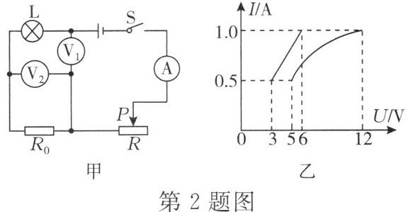 2. 如图甲所示,闭合开关 $ S $,将滑动变阻器的滑片 $ P $ 从最右端滑至最左端时,小灯泡 $ L $ 恰好正常发光。电流表示数与两电压表示数的关系图像如图乙。则电源电压为
