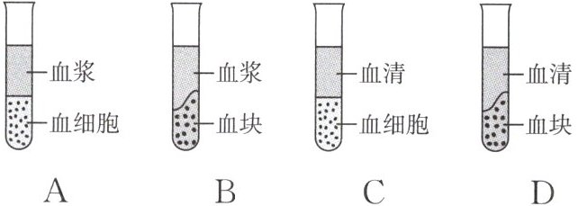 8. 小刚在探究血液的成分时,将新鲜的鸡血分别放入 A、B、C、D 四个试管内,在 A、D 两试管内加入了抗凝剂,B、C 不做任何处理,静置较长一段时间后,下列图示中正确的是(