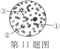 11. 实验室里,小科制作了一张血涂片,将其放在显微镜下观察。如图所示是显微镜下的一个视野,下列有关说法正确的是(