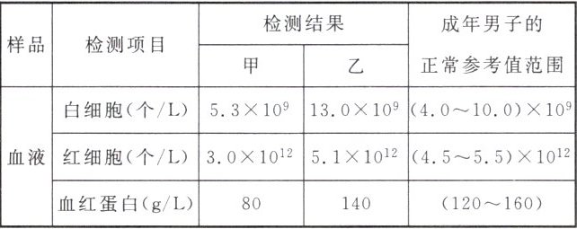 (1)医生依据甲的血检结果中红细胞和血红蛋白的数值都偏低,判断他可能患有