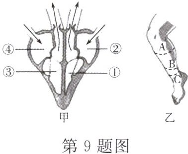 (选填“开放”或“关闭”),动脉瓣开放,血液由心室流向动脉。(3)若在野外不慎被毒蛇咬伤。伤口在B处(如图乙所示),我们在拨打急救电话“120”后,可用鞋带(或其他物品)暂时捆扎在图乙中的
