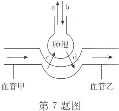 7. 如图所示为肺泡内的气体交换示意图,a、b代表呼吸运动过程,c、d代表气体。下列描述正确的是(