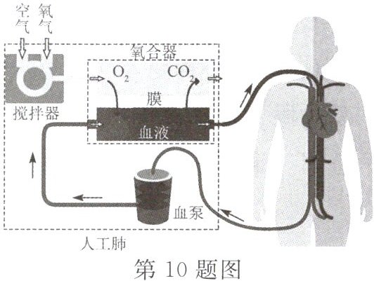 10. 体外膜肺氧合技术简称ECMO(如图所示),是一种人工心肺机,氧合器相当于人工肺,当遇到重症肺炎患者时,他的肺部可能已经发展到白肺阶段,呼吸功能很差,几乎失去氧合功能,此时要采用ECMO替代肺部,下列相关描述错误的是(