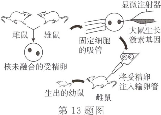 13. 如图所示是转基因超级鼠的研制过程。科学家将大鼠生长激素基因导入一个小鼠的受精卵内,实验结果是生出的转基因鼠比与它同胎所生的小鼠生长速度快 2~3 倍,体积大 1 倍。