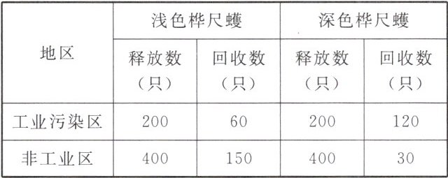 15. 生物学家做了如下实验,将深色桦尺蠖和浅色桦尺蠖分别进行标记,然后放养于工业污染区和没有污染的非工业区。经过一段时间以后,将释放的桦尺蠖尽量收回,统计结果如下表所示: