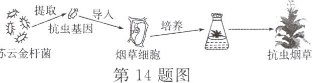 14. 运用现代科技手段,从某种生物中提取特定的基因,转入其他生物中,从而产生具有特定优良性状的新生物,这就是转基因技术。如图所示是转基因抗虫烟草的培育过程。