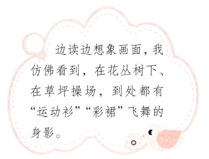 边读边想象画面,我仿佛看到,在花丛树下、在草坪操场,到处都有“运动衫”“彩裙”飞舞的身影。