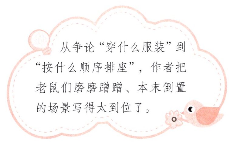 老鼠国王马上就想到另外一个问题:“嗯,我们是不是应该统一一下服装呢?”礼仪大臣立即凑上来说:“对,对,对,大王,还是您英明!和我想到一块儿了!”“那么,我们穿什么衣服好呢?”一只叫溜溜的小老鼠立刻拍上国王的马屁说:“那,我们都穿陛下——您这样的衣服吧?”老鼠国王把眼一瞪:“什么,穿和我一样的衣服,你也想过过当国王的瘾(yǐn),是不是?”溜溜马屁拍到马腿上,吓得赶紧一缩头,不吱声了。礼仪大臣和溜溜是亲戚(qī),他马上求情说:“大王,那么除了您之外,我们都穿溜溜这样的灰衣服,好不好哇?”国王的脸色有所缓和地说:“那,好吧。”大家换好了衣服。国王又对他的总理大臣说:“现在,你把座位排一下。”总理大臣说:“那,您当然坐在正中间的位置啦!其余的嘛,啊……”国防大臣立刻高声地叫道:“按官位的大小排!”一只上了年纪、老态龙钟的老鼠不服气,他喊着说:“按年龄大小排!”一只叫米勒(lè)的老鼠也不肯吃亏:“按高矮次序排!”国防大臣发火了,他拔出枪来,朝洞顶“砰”地放了一枪,恶狠狠地说:“我说,按官衔大小排!”大家都怕他那支枪,只好忍气吞声地服从了。