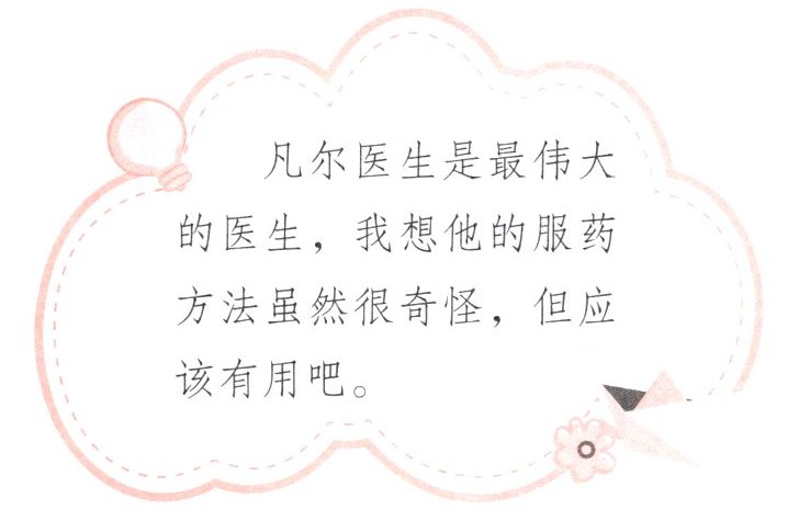 于是,凡尔医生开始着手研究了。他绞(jiǎo)尽脑汁,夜以继日地研究,终于有了眉目。他选用了一百多种稀奇古怪的药,配制成一种新的丸药。然后,作为一种辅助治疗(liáo),还设计了一种非常奇特的服药方法。下面是“服药方法”中的小部分细节:
