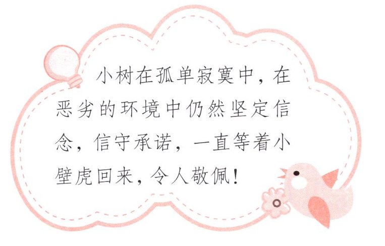2. 从以下地方看出小树和小壁虎是好朋友:小壁虎把断了的尾巴寄存在小树这里,等伤好回来取;小树一直等着小壁虎回来取尾巴,即使想搬家也因这个承诺而收回念头;在等待过程中,小树向响尾蛇、蜈蚣打听小壁虎消息并让其转告小壁虎回来取尾巴;最后小壁虎回来,小树高兴地抱着它跳旋转舞。