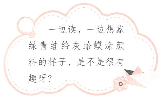 不一会儿,绿青蛙拎着一大桶绿色的颜料回来了。他用刷子蘸(zhàn)上颜料,一下一下往灰蛤蟆身上涂。背上涂好了,涂脸上;脸上涂好了,涂四肢。“好了,去照照镜子吧!”绿青蛙放下刷子说。