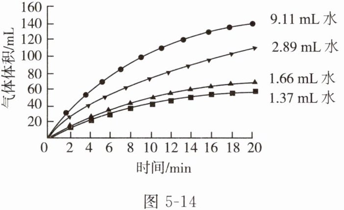 向图5-12所示实验装置的锥形瓶中加入 $ 1.4 g $ 过碳酸钠、 $ 0.2 g MnO_2 $ 和 $ 9.11 mL $ 水,待反应完全后收集到约 $ 159.1 mL $ 水(生成氧气的量与实验一中试剂得到氧气的最大量相等)。其他试剂质量不变,再分别用不同体积的水进行实验。记录并处理20 min内数据,如图5-14所示。