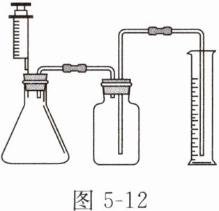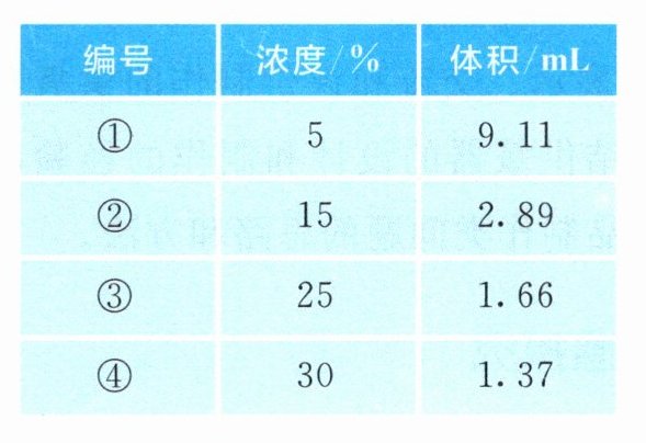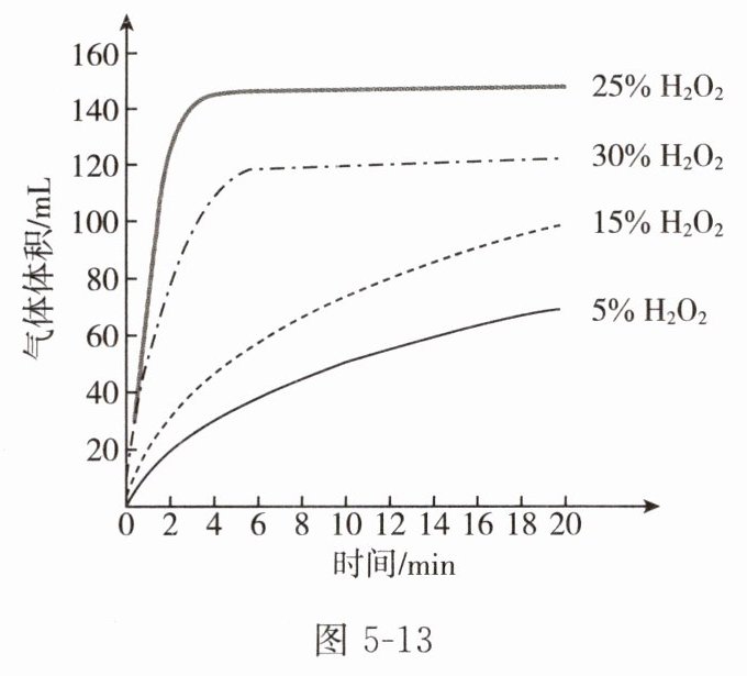 学习小组设计了图5-12所示实验装置,用下表中过氧化氢的质量相等的四组溶液进行实验。在集气瓶中加满水,锥形瓶中加入 $ 0.2 g MnO_2 $,注入溶液,记录并处理20 min内数据,如图5-13所示(注:下表中的浓度是过氧化氢的质量与过氧化氢溶液的质量的比值)。
