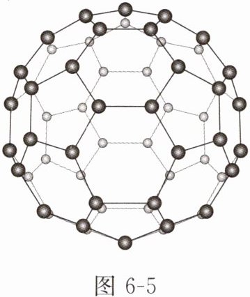 碳元素组成的单质 $ {C_{60}} $(结构如图 6 - 5 所示)在 20 世纪 80 年代被发现,其结构与石墨和金刚石截然不同,是一种由多个正多边形封闭而成的空心球体,形似足球,又名足球烯。
