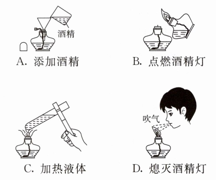 解析 用漏斗向熄灭的酒精灯内添加酒精,A项正确;用燃着的酒精灯去引燃另一只酒精灯可能会引发火灾,B项错误;给液体加热时,液体体积不能超过试管容积的$\dfrac{1}{3}$,C项错误;用嘴吹灭酒精灯,可能导致火苗进入灯内,引发火灾,D项错误。