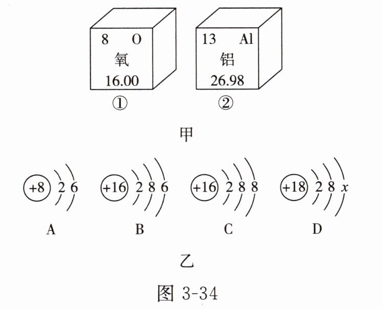 - **【典例】** 元素周期表是学习和研究化学的重要工具。图 3 - 34 甲中①、②为氧元素、铝元素在元素周期表中的信息示意图,乙中 A、B、C、D 是四种粒子的结构示意图。请分析并回答问题。