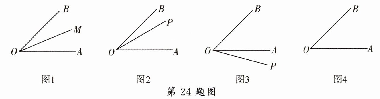 24. (本题10分)如图1所示,OM平分$\angle AOB$,则称射线OB,OA关于OM对称。