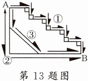 13. 如图, 从 A 地到 B 地有三条路①②③可走, 每条路长分别为 $ l, m, n $ (图中 “ ” “ ” 表示直角), 则第