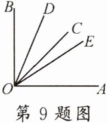 9. 如图, $ \angle A O B=90^{\circ}, O C $ 平分 $ \angle A O B, O D $ 平分 $ \angle B O C, O E $ 平分 $ \angle A O D $, 则 $ \angle C O E $ 等于 (