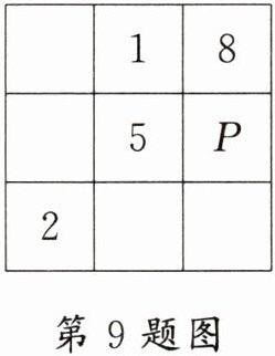 9. 如图,现有一个$3×3$的方格。每个小方格内均有$1\sim9$不同的整数,要求方格内每一行、每一列以及每一条对角线上的三个数之和相等,图中给出了部分整数,则$P$处所对应的数是(