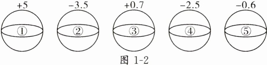 (2)检测图 1 - 2 中①~⑤号 5 个排球,其中质量超过标准的克数记为正数,不足的克数记为负数,从质量的角度看,