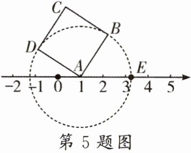 5. 如图,已知正方形$ABCD$的面积为 5,点$A$在数轴上,且表示的数为 1。现以点$A$为圆心,$AB$为半径画圆,和数轴交于点$E$($E$在$A$的右侧),则点$E$表示的数为(