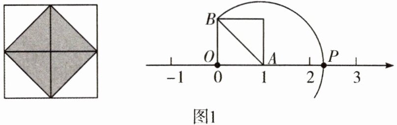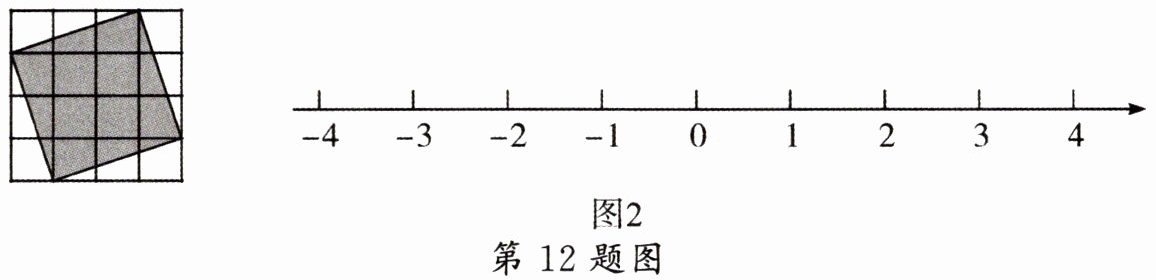 12. 如图 1 所示,依次连结$2×2$方格四条边的中点,得到一个阴影正方形,设每一方格的边长为 1 个单位长度,则这个阴影正方形的边长为$\sqrt{2}$。
