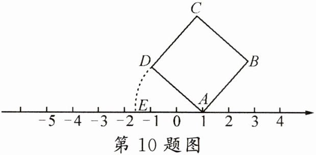 10. 如图,面积为5的正方形ABCD的顶点A在数轴上,且表示的数为1,若$AD=AE$,则数轴上点E所表示的数为(