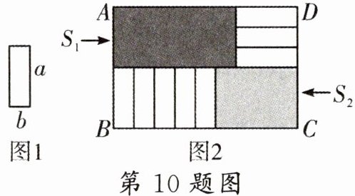 10. 已知8个长为$a$,宽为$b$的小长方形(如图1所示),不重叠无空隙地摆放(如图2所示)在长方形$ABCD$中,$BC$长度变化时,左上角阴影面积$S_{1}$与右下角阴影面积$S_{2}$的差没有变化,则$a,b$之间的关系应满足(