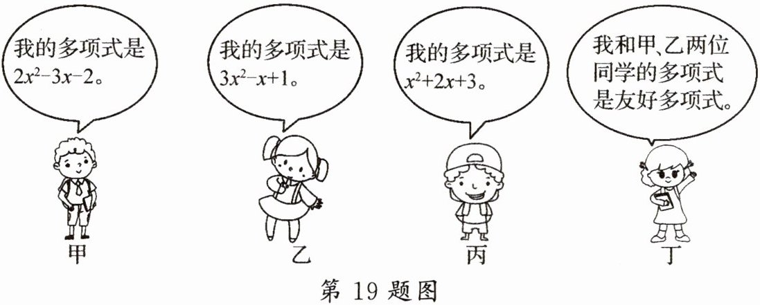 19. (本题6分)数学课上,老师设计了一个数学游戏:若两个多项式相减的结果等于第三个多项式,则称这三个多项式为“友好多项式”。甲、乙、丙、丁四位同学各有一张多项式卡片,下面是甲、乙、丙、丁四位同学的对话: