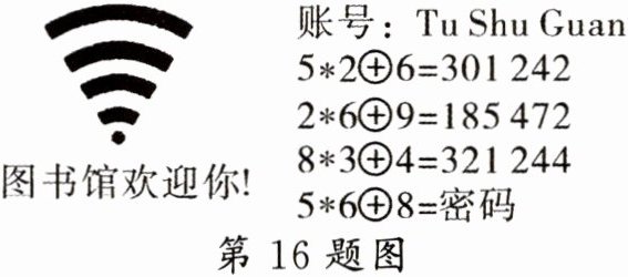 16. 如图,某学校图书馆把Wi-Fi密码做成了数学题。小红在图书馆看书时,思索了一会儿,输入密码,顺利地连接到了“Tu Shu Guan”的网络,那么她输入的密码是