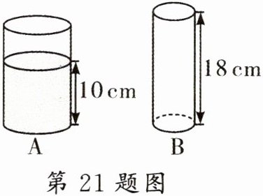 21. (本题6分)如图,现有$A,B$两个圆柱形容器,$B$容器的底面积为$S$,高为$18\mathrm{cm}$,$A$容器的底面积是$B$容器底面积的$2$倍,容器内水的高度为$10\mathrm{cm}$。