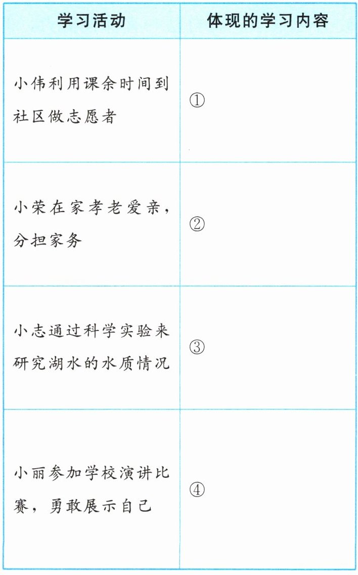 7.(1)①在社会实践中学习,帮助他人、服务社会 ②在家庭生活中学习,践行中华传统美德 ③通过做科学实验获取知识、提升能力 ④通过参加比赛,提升能力(符合题意即可)