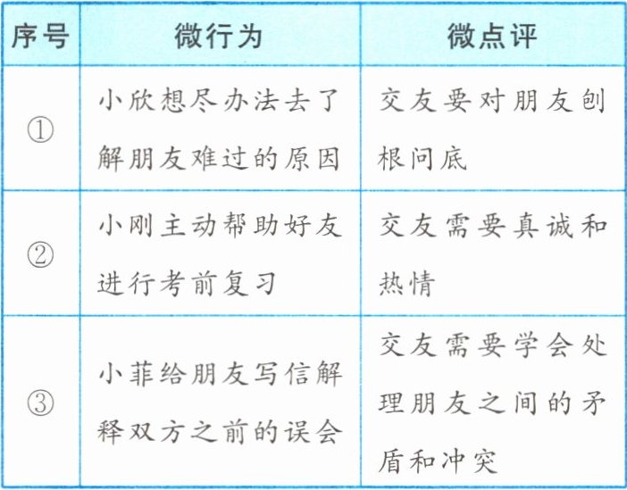 (2)①错误。交友需要学会关心和尊重对方,把握好彼此的界限和分寸,而不是一味地对朋友刨根问底。②正确。交友需要真诚和热情。我们只有抱着真诚和热情的态度与他人交往,才会获得真挚的友谊。③正确。交友需要学会处理朋友之间的矛盾和冲突。发生矛盾和冲突时,我们可以一起协商,寻找彼此能够接受的解决方式。
