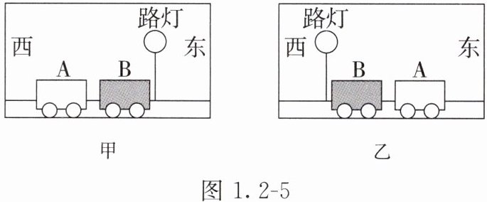 6. 小明乘坐的公交车正在向东行驶,他用手机先后拍摄窗外同一路灯和同样两辆小汽车 A、B,得到如图 1.2 - 5 所示的甲、乙两张照片。以小汽车 A 为参照物,小汽车 B