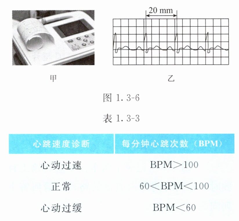 8. 图1.3 - 6甲是某次心电图仪正在工作的情景,图纸以$25mm/s$的速度匀速移动,心电图仪在纸上记录下的信息如图1.3 - 6乙所示,心跳速度的诊断与每分钟心跳次数(BPM)的关系如表1.3 - 3所示。