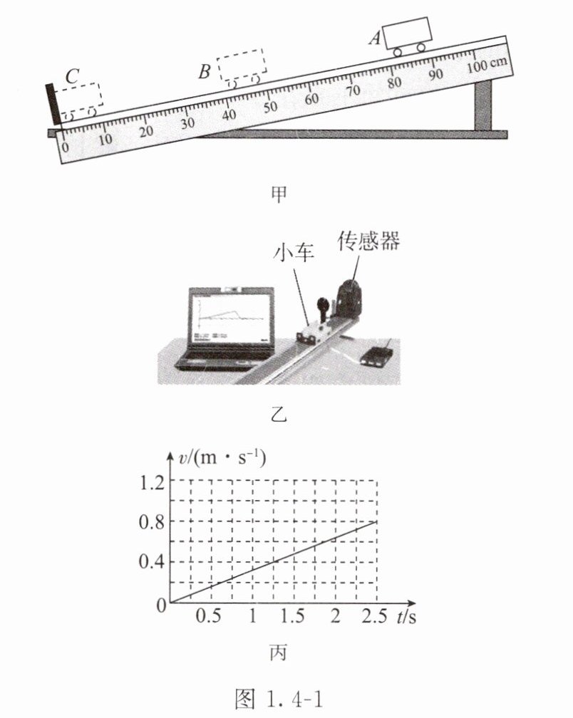 m/s。(4)传感器利用超声波可以测出在不同时刻小车与它的距离,然后计算机再根据时间就可以算出运动的小车在不同位置时的速度。如图1.4-1乙所示,小明重新调整斜面坡度,利用传感器再次进行实验。屏幕图像为如图1.4-1丙所示的$v-t$图像,从图像可以看出小车在斜面上下滑时做