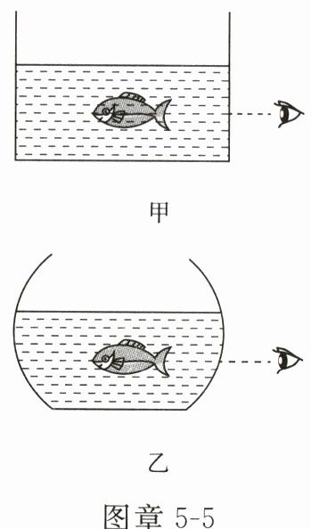 11. 如图章5-5所示,方形与球形鱼缸并列放置,小军从侧面看到两缸中的鱼大小相同。忽略玻璃的影响,看到的鱼是光从