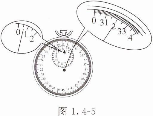 3. 为测量自己的跑步速度,小明在一段长$200m$的平直道路起点开始计时,跑到终点停止计时,秒表的示数如图1.4-5所示。小明跑完此段路程用时