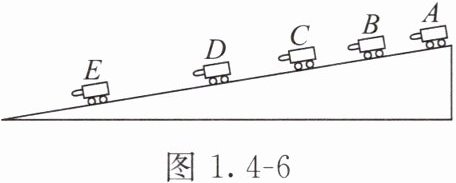 2. (多选)图1.4-6为小车由静止开始沿斜面下滑的频闪照片示意图(即通过频繁开启闪光灯在同一张照相底片上得到小车运动到不同位置的照片),已知相邻两次闪光的间隔时间均为$0.1s$,且第一次闪光时小车的前轮恰好从$A$点开始运动。根据照片测得各相邻闪光时刻小车前轮与斜面接触点间的实际距离分别为$AB = 2.4cm$,$BC = 7.3cm$,$CD = 12.2cm$,$DE = 17.2cm$。由此可知,下列说法正确的是(