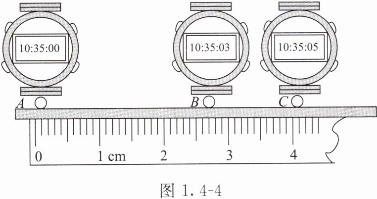 2. 如图1.4-4所示,小球水平向右做直线运动,数字时钟显示的时间格式是“时:分:秒”,则小球从$A$点到$C$点的平均速度是