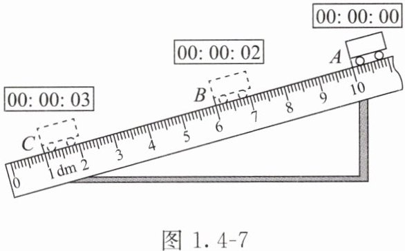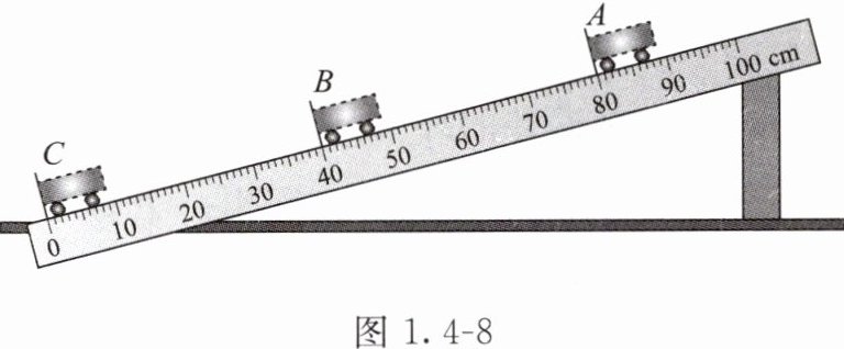 4. 如图1.4-8所示,测量小车在斜面上运动的平均速度。让小车从斜面上的$A$点由静止开始下滑,分别测出小车到达$B$点和$C$点的时间,即可测出不同阶段的平均速度。