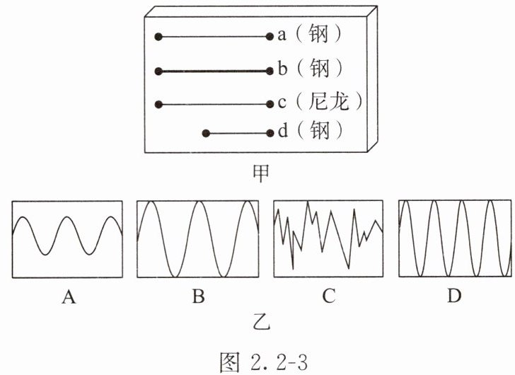 6. 某小组同学利用长短、粗细、材料不同的琴弦来探究音调和哪些因素有关。他们选用的琴弦长度、粗细、材料如图 2.2 - 3 甲所示,其中琴弦 a、c、d 的粗细相同,琴弦 b 最粗;琴弦 a、b、c 的长度相同,琴弦 d 最短,并且每根琴弦固定在“音箱”上的松紧程度一致。